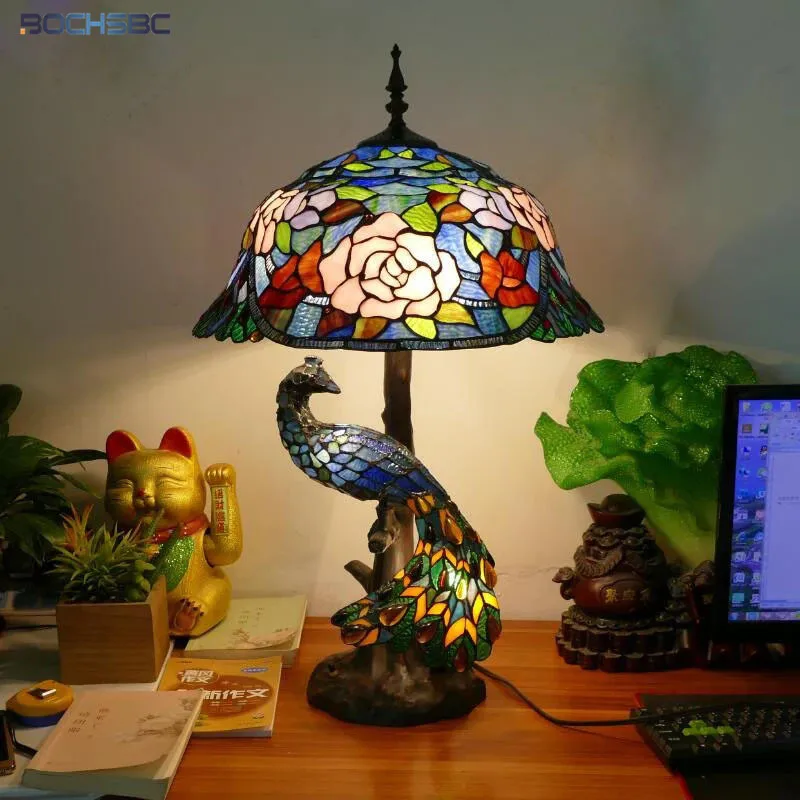 Special Offer BOCHSBC Tiffany Style Desk Lamp Peacock Art House Decor Table Light Stained Glass Luxury Eyeshield Collect Colorful Lighting Discount 0% Today!